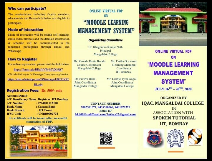 Organized by :IQAC, Mangaldai College Date of Event : 2020-07-16 No of Participants : 74 Document uploaded by: IQAC Department A online FDP on Moodle Learning Management System was organised by the IQAC, Mangaldai College, in collaboration with Spoken Tutorial, IIT Bombay, from 16-7-2020 to 20-7-2020 under PMMMNMTT. At the inauguration of the programme, Dr. Khagendra Kumar Nath, Principal, Mangaldai College, highlighted the importance of e-learning platforms in the context of online teaching due to Covid-19 pandemic.